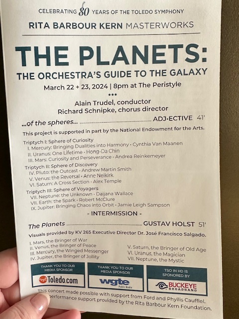 In the spring of 2024, Toledo [was] in the direct viewing path of a total solar eclipse. To celebrate this phenomenon, the Toledo Symphony has commissioned ADJ•ective New Music – a composers’ collective with ties to Toledo – to compose a suite of new planets. Paired with Gustav Holst’s Planets with stunning visuals from KV 265, this program explores both the scientific mysteries of space and our planets and the human imagination of what lies beyond our world.
